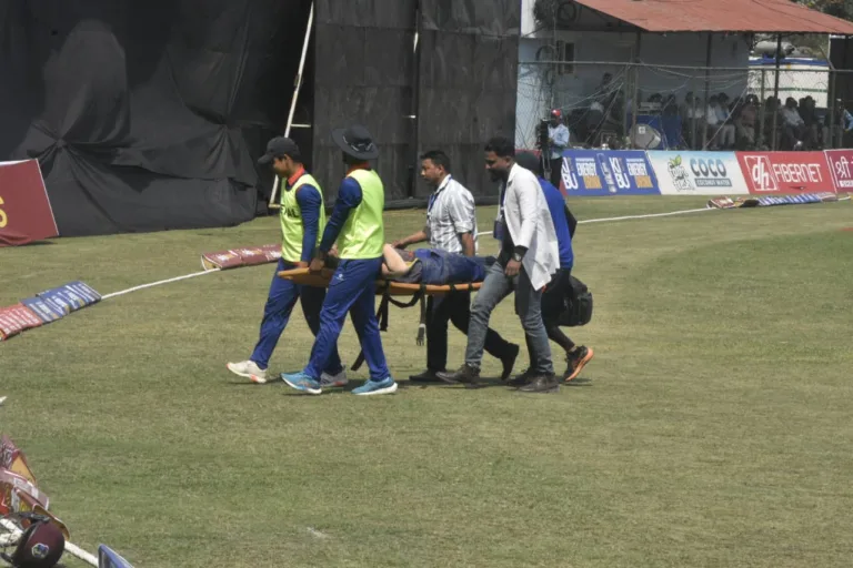 उनी ब्याटिङका क्रममा लडेका थिए । खुट्टामा समस्या आएपछि उनलाई स्ट्रेचरमा राखेर मैदान बाहिर लगिएको छ ।