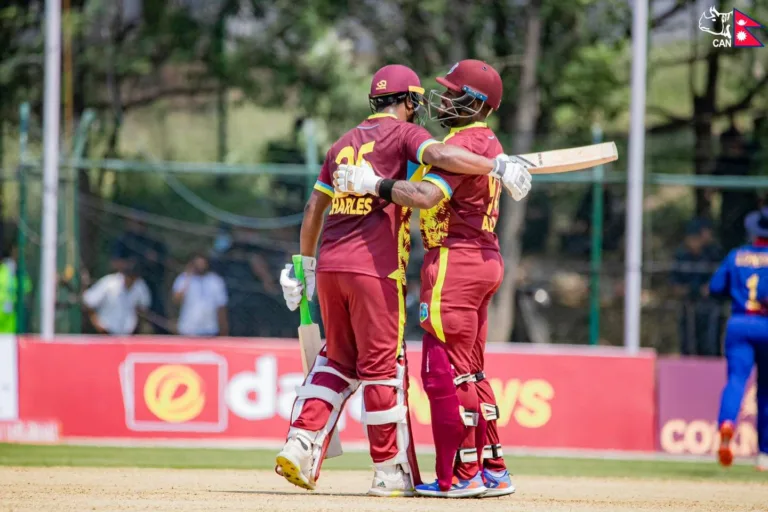 कीर्तिपूरस्थित त्रिवि मैदानमा टस जितेर पहिले ब्याटिङमा उत्रिएको वेस्ट इन्डिजले निर्धारित २० ओभरमा ३ विकेट गुमाएर २२७ रन जोड्यो । उसका लागि जोनसन चार्ल्सले अविजित रहँदै शतकीय पारी खेले ६१ बलमा १३ चौका र ७ छक्का हिर्काएका उनले ११९ रन बनाए ।