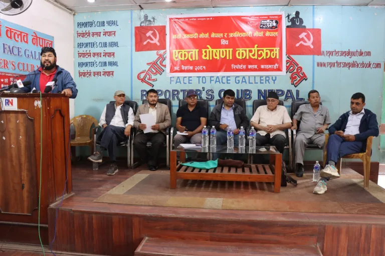 काठमाडौं, १९ वैशाख । नयाँ जनवादी मोर्चा नेपाल र क्रान्तिकारी मोर्चा नेपालबीच एकता भएको छ । आज (बुधबार) १३५औं अन्तर्राष्ट्रिय श्रमिक दिवसको अवसरमा रिपोर्टर्स क्लब नेपालमा पत्रकार सम्मेलन गरी दुई मोर्चाबीच एकता भएको जानकारी गराइएको हो ।