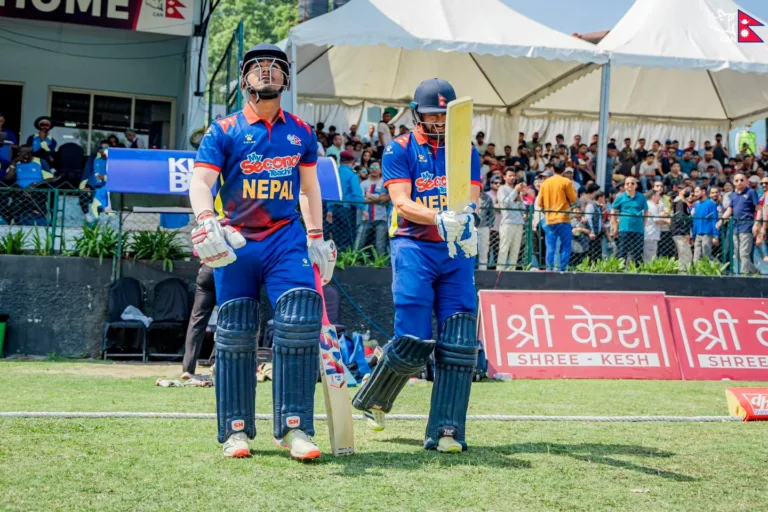 काठमाडौं,१९ वैशाख । टी-२० सिरिजअन्तर्गत वेस्टइन्डिजले दिएको विशाल लक्ष्य पछ्याएको नेपालले चौथो विकेट गुमाएको छ ।