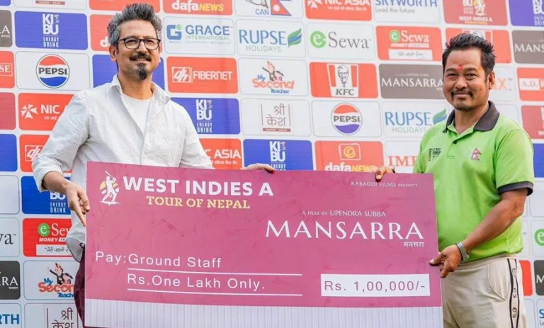 काठमाडौं, वैशाख २४ । गत शुक्रबारबाट प्रदर्शनमा आएको फिल्म ‘मनसरा’ टिमले हालै सम्पन्न नेपाल र वेस्ट इन्डिज ‘ए’ बीच भएको ५ खेलको सिरिजमा कीर्तिपुर क्रिकेट मैदानमा काम गर्ने कर्मचारीलाई १ लाख रुपैयाँ सहयोग गरेको छ ।