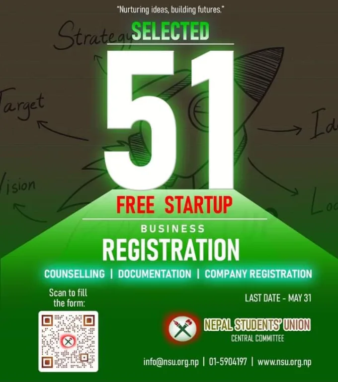 काठमाडौं, ३० बैशाख । नेपाल विद्यार्थी संघले नयाँ व्यवसाय गर्नेहरुको लागि स्टार्टअप योजना माग गरेको छ । र, उनीहरुमध्येबाट उत्कृष्ट ५१ योजनालाई प्रशिक्षण दिई लगानीकर्ता खोजिदिने नेविसंघको घोषणा छ । नेविसंघले प्रविधि, दिगो विकास, स्वास्थ्य सेवामा आधारित व्यावसायिक योजनासहित प्रस्ताव दर्ताको आह्वान गरेको हो।