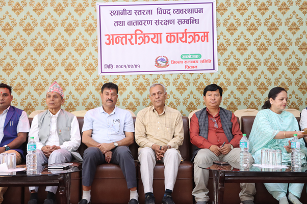 जिल्ला समन्वय समितिका प्रमुख नारायणप्रसाद अधिकारीको अध्यक्षतामा भएको कार्यक्रममा वन मन्त्रालयका विकास वातावरण तथा जलवायुबिज्ञ हरिप्रसाद शर्मा र सशस्त्र प्रहरी बल १७ नम्बर वाहिनी आँपटारीका सशस्त्र प्रहरी नायव उपरीक्षक मनोज गुरुङले विपद् र यसको प्रतिकार्यबारे कार्यपत्र प्रस्तुत गरेका थिए । समन्वय प्रमुख अधिकारीले विपद्सँग बाँच्ने क्षमता नभएकालाई कसरी वचाउन सकिन्छ भन्ने मुख्य उद्देश्य राखेर काम गर्नुपर्ने बताए ।
