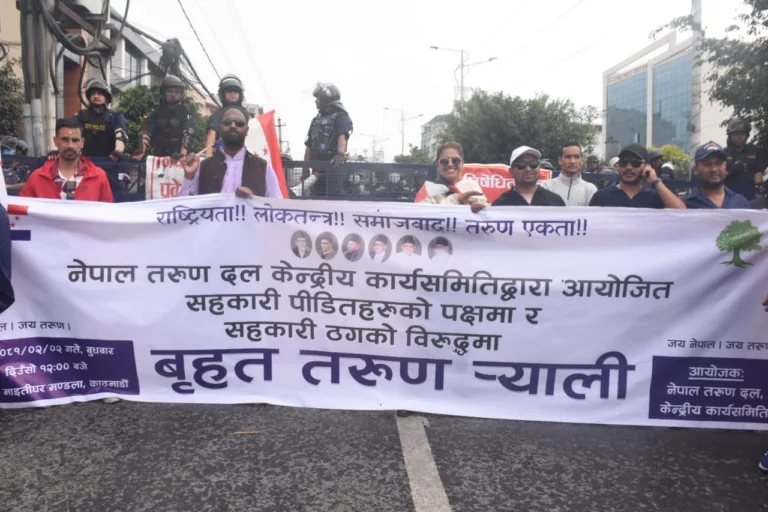 काठमाडौं । प्रमुख प्रतिपक्षी दल नेपाली कांग्रेसको भ्रातृ संस्था नेपाल तरुण दलले सहकारी ठगीमा उपप्रधान तथा गृहमन्त्री रवि लामिछानेको संलग्नताबारे संसदीय छानबिन समिति गठन गर्न माग गर्दै प्रदर्शन गरेको छ।
