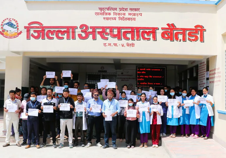बैतडी, ४ जेठ । जोखिम भत्ता पाउनुपर्ने माग राख्दै आन्दोलनमा उत्रिएका जिल्ला अस्पताल बैतडीमा कार्यरत चिकित्सक र स्वास्थ्यकर्मी काममा फर्किएका छन् । गत आइतबारदेखि आकस्मिकबाहेकका सबै सेवा ठप्प पारेर आन्दोलनमा उत्रेका चिकित्सक र स्वास्थ्यकर्मी पुनः काममा फर्केका हुन् ।