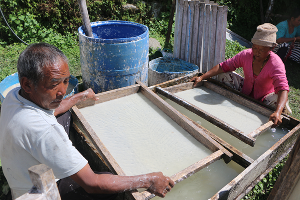 “जाडो मौसममा सुक्न अलिक समय लाग्ने भएकाले गर्मी मौसममा भन्दा कम उत्पादन हुन्छ”, शेर्पाले भने, “गर्मी मौसममा बढीमा तीन घण्टाभित्र जालीमा राखेको लेदो सुकेर कागज तयार हुन्छ तर जाडामा सुक्न पाँच घण्टा लाग्छ ।”