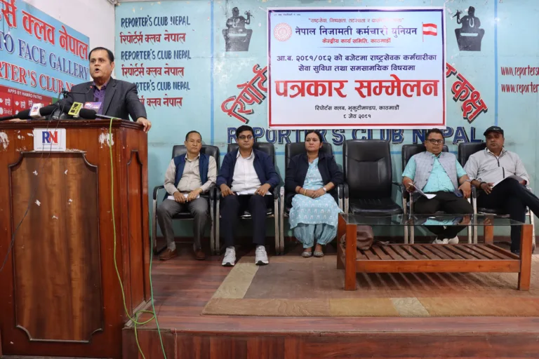 काठमाडौं, ८ जेठ । नेपाल निजामती कर्मचारी युनियनले सरकारले तोकेको मर्यादाक्रम एवम् पदसोपानबमोजिम निजामती सेवामा तलबभत्ता समायोजन हुनुपर्ने बताएको छ । आज (मंगलबार) रिपोर्टर्स क्लब नेपालमा पत्रकार सम्मेलन गर्दै युनियनले संघ, प्रदेश र स्थानीय तहमा कार्यरत सबै तह, श्रेणी र पदका कर्मचारीहरूलाई देशको आर्थिक अवस्था, सामाजिक परिवेश, बढ्दो महङ्गीका आधारमा नेपालसँग समान आय भएका विश्वका अन्य देश र सार्क राष्ट्रहरूले प्रदान गर्ने सरहको तलब तथा सेवा सुविधाको व्यवस्था गरिनुपर्ने बताएको हो ।