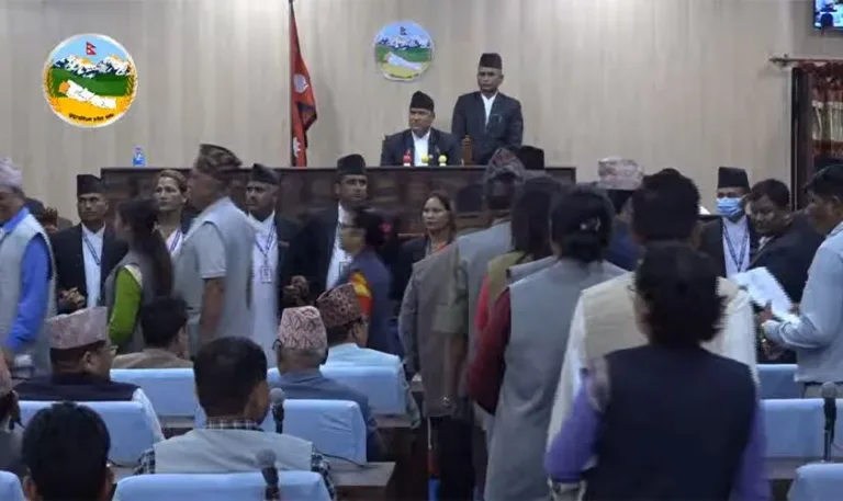 बैठकमा सभामुख भीमबहादुर भण्डारीले प्रदेश प्रमुख नजिर मियाँबाट बर्खे अधिवेशन आह्वान सम्बन्धी आएको पत्र सुनाउन खोज्दा प्रतिपक्ष दलहरूले विरोध जनाउँदै बाहिरिएका हुन् । विपक्षको उपस्थिति विना नै मुख्यमन्त्री दीर्घ बहादुर सोडारीले प्रदेश सरकारको आगामी आर्थिक वर्षको विनियोजन विधेयकको सिद्धान्त र प्राथमिकता पेस गरिरहेका छन् ।