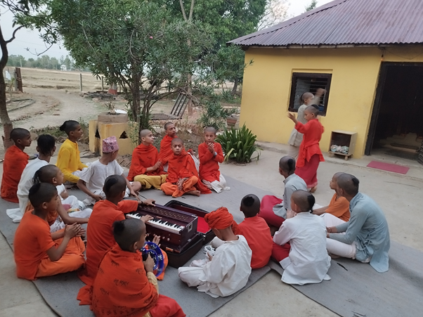 बेलुका ६ बजे खाना खाने घण्टी लाग्छ । खानापछि ध्यान गर्ने र सन्ध्याको तयारी गरी आरती गर्ने र भजनकीर्तनमा रमाउने गर्दछन् । उनीहरूले मादल, हार्मोनियम बजाएर भजन गाउने, नाच्ने र रमाइलो पनि गर्छन् । उनीहरुको दैनिकी एकै किसिमको छ । उनीहरू संस्कृत भाषा, व्याकरण, कर्मकाण्ड र वेदसँगै अङ्ग्रेजी, नेपाली र गणित पढ्छन् ।