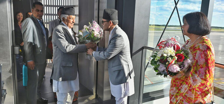 राष्ट्रपति पौडेल नेतृत्वको प्रतिनिधिमण्डललाई शनिबार अपराह्न बर्लिन ब्रान्डेनवर्ग अन्तरराष्ट्रिय विमानस्थलमा जर्मनीका लागि नेपालका राजदूत रामकाजी खड्का तथा उनकी धर्मपत्नी, जर्मनीका राष्ट्रपतिको सङ्घीय परराष्ट्रमामिला कार्यालयका वरिष्ठ अधिकारीले स्वागत गरेको बर्लिनस्थित नेपालको राजदूतावासले आज जनाएको छ।