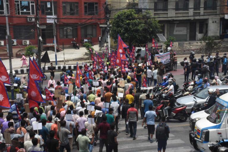 आम जनता पार्टीका महासचिव त्रिभुवन साहको विशेष उपस्थिति एवं कवाड संघर्ष समितिका नेता रामकेवल साह, संजय साह, सरोज श्रेष्ट लगायतका नेतृत्वमा भएको उक्त प्रदर्शनमा “छोटे राजाहरुको आतंक बन्द गर, कबाड व्यवसायीको रक्षा गर, कानुनी शासन लागु गर, अदालतको निर्णयको सम्मान गर” जस्ता नाराहरु भएको ब्यानर बोकेर उनीहरु प्रदर्शनमा छन् । Photo By: Mukunda Kalikote/Reporters Nepal