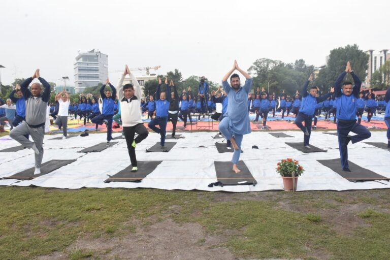 काठमाडौं, असार ५ । नेपाल प्रहरीले १० औं अन्तर्राष्ट्रिय योग दिवसको अवसर पारेर योगाभ्यास कार्यक्रमको आयोजना गरेको छ । पतंजली योग समिति नेपालको सहकार्य तथा नेपाल प्रहरी प्रधान कार्यालयको आयोजनामा आज प्रहरी प्रधान कार्यालयमा भएको योगाभ्यास कार्यक्रममा उपप्रधानमन्त्री तथा गृहमन्त्री रवि लामिछाने, गृह सचिव एकनारायण अर्याल, नेपाल प्रहरीका महानिरिक्षक वसन्तबहादुर कुँवर, सशस्त्र प्रहरी बलका महानिरीक्षक राजु अर्याल, राष्ट्रिय अनुसन्धान विभागका मुख्य अनुसन्धान निर्देशक हुतराज थापालगायत सहभागी रहेका थिए ।
