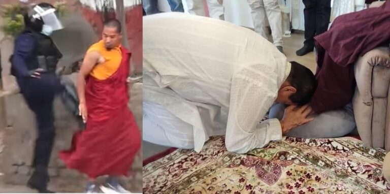 गिज्याइरहेको दुई तस्विरः स्वदेशी भिक्षु कुटिन्छन्, विदेशी गुरु पुजिन्छन्, को हुन नारायणकाजीले ढोगिरहेका व्यक्ति ?