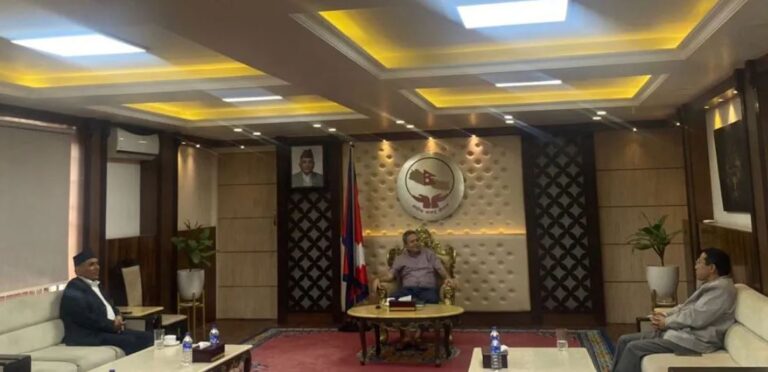 काठमाडौं, असार ६ । संघीय संसद् सचिवालयका कर्मचारीको आन्दोलनबारे सभामुख, राष्ट्रिय सभाका अध्यक्ष र अर्थमन्त्रीबीच छलफल भइरहेको छ । सभामुख निवासमा जारी छलफलमा सभामुख देवराज घिमिरे, राष्ट्रिय सभा अध्यक्ष नारायणप्रसाद दाहाल र अर्थमन्त्री वर्षमान पुनबीच छलफल जारी रहेको हो ।