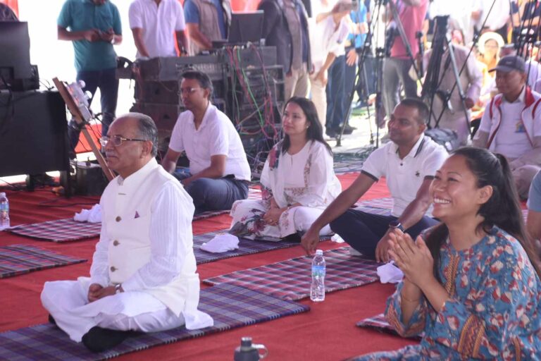 विश्व योग दिवसका अवसरमा प्रधानमन्त्री पुष्पकमल दाहाल प्रचण्डले सानोठिमी भक्तपुरमा आयोजित सामूहिक योग कार्यक्रममा सहभागीता जनाएका छन् । उक्त कार्यक्रममा प्रधानमन्त्री दाहालले योगसम्बन्धी ज्ञानविज्ञानको अध्ययन गरिरहेका विश्वभरकै अध्येताहरूका लागि नेपाल मूल गन्तव्य बन्न सक्ने विश्वास व्यक्त गरेका छन्। फोटोः मुकुन्द कालिकोटे/ रिपोर्टर्स नेपाल