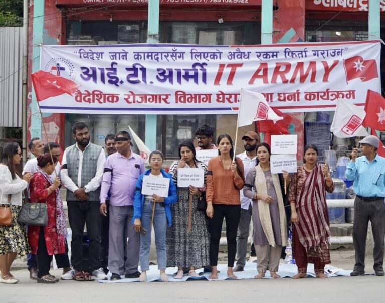 काठमाडौं, ९ असार । आम जनता पार्टीको भातृ संगठन आईटी आर्मीले वैदेशिक रोजगारमा ठगिएका पीडितलाई न्याय दिलाउनको लागि आन्दोलन जारी राखेको छ । आज (आइतबार) आन्दोलनको ८औं दिनपनि आईटी आर्मीले आन्दोलनलाई जारी राखेको छ ।