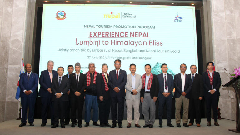 काठमाडौ, असार १४ । बैङ्ककस्थित नेपाली राजदूतावासले बिहीबार नेपाल पर्यटन बोर्ड, नेपाल वायुसेवा निगम, नेपाल एशोसिएसन अफ टुर एण्ड ट्राभल एजेन्ट्स (नाट्टा), ट्रेकिङ एजेन्सिज एशोसिएसन अफ नेपाल (टान) र नेपाल पर्वतारोहण सङ्घसँगको संयुक्त आयोजनामा बैङ्ककमा पर्यटन प्रवर्द्धन कार्यक्रम आयोजना गरेको छ ।