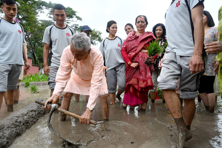शीतल निवासमा धान दिवस: राष्ट्रपति पौडेल बाउसे, प्रथम महिला सविताले रोपिन् धान