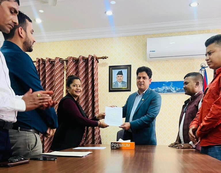 काठमाडौं, १७ असार । नेपाली कांग्रेसको उद्यमशीलता र साना तथा मझौला व्यवसायी विकास विभागले उद्योग, वाणिज्य तथा आपूर्तिमन्त्री दामोदर भण्डारीलाई ध्यानाकार्षण पत्र बुझाएको छ । आज (सोमबार) कांग्रेस केन्द्रीय सदस्य एवं विभाग प्रमुख सीता थपलिया (उर्मिला) को नेतृत्वमा मन्त्रालय पुगेका टोलीले मन्त्री भण्डारीलाई ध्यानाकार्षण पत्र बुझाएको थियो ।