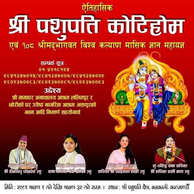 काठमाडौं, ३० असार । आगामी साउन १ देखि ३२ गतेसम्म पशुपति क्षेत्र, (वनकाली) हंस मण्डप, काठमाडौंमा पशुपति कोटीहोम नेपाल माहात्म्य तथा १०८ श्रीमद्भागवत विश्व कल्याण मासिक ज्ञान महायज्ञ २०८१ आयोजना गरिएको छ । मानव सेवा फाउण्डेसन, नेपाललगायतका संस्थाद्वारा कोटीहोम महात्म्य तथा महायज्ञ आयोजना गरिएको हो ।