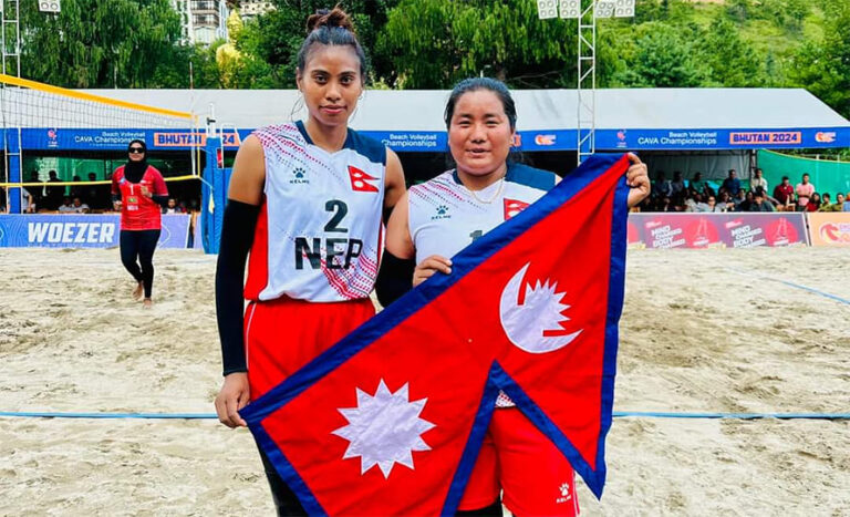 काठमाडौँ, १९ साउन : नेपालको महिला राष्ट्रिय बिच भलिबल टोली भुटानमा जारी काभा बिच भलिबल च्याम्पियनसिपको फाइनलमा पुगेको छ । कमला पुन र मनिषा चौधरीको जोडीले फाइनलको यात्रा तय गरेको हो ।