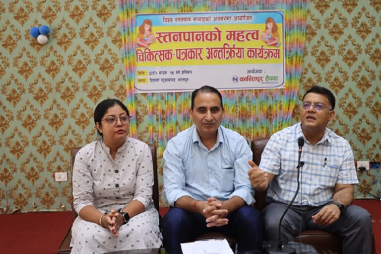 विश्व स्तनपान सप्ताहका अवसरमा कान्तिपुर हेल्थ अनलाइनद्वारा आज भरतपुरमा आयोजित ‘स्तनपानको महत्वः चिकित्सक–पत्रकार छलफल कार्यक्रम’ मा भरतपुर अस्पतालका बालरोग विशेषज्ञ डा.श्वेताकुमारी गुप्ताले स्तनपान गराउँदा आमाले मोबाइल प्रयोग गर्न नहुने बताईन्् ।