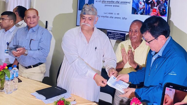 काठमाडौं, साउन २३ । राष्ट्रिय प्रजातन्त्र पार्टी (राप्रपा) का सांसद एवम् पूर्वाधार विकास समिति सभापति दिपक बहादुर सिंहले एक वर्षको तलब तिलगंगा सामु्दायिक आँखा अस्पताल हेटौंडालाई हस्तान्तरण गरेका छन् ।