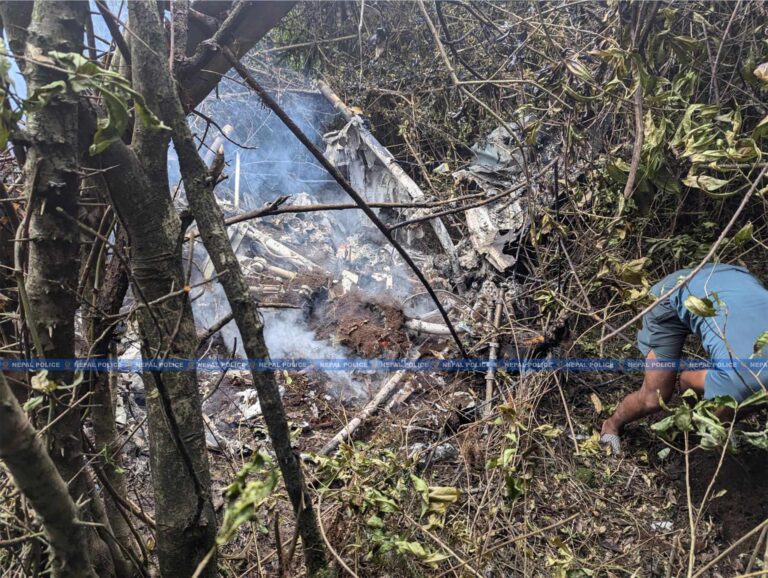 रसुवाको स्याफ्रुवेसीका लागि काठमाडौंबाट उडेको एयर डाइनस्ट्रीको हेलिकोप्टर बुधबार दिउँसो दुर्घटनामा परेको थियो । लगत्तै घटनास्थल पुगेको प्रहरी टोलीले ५ जनाको शव निकालेको थियो । तस्विर: नेपाल प्रहरी