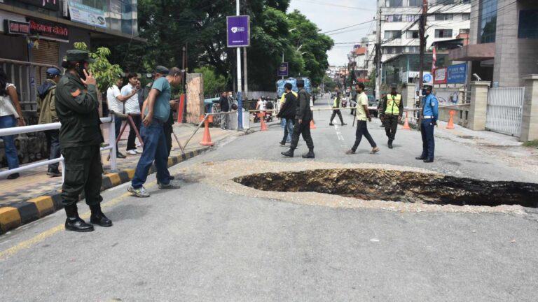 काठमाडौं, साउन २५ । दरबारमार्गमा रहेको महेन्द्र शालिक–काठमाडौं प्लाजा जोड्ने सडक भाँसिएपछि सवारीसाधन आवागमन बन्द गरिएको छ। महानगर प्रहरीका अनुसार टुकुचा खोला माथीको एकतर्फी सडकमा ठूलो भ्वाङ परेपछि सवारीसाधन आवतजावतमा रोक लगाइएको छ। काठमाडौं महानगरपालिकाकै कार्यालय नजिक भ्वाङ परेको सडक टाल्न सडक विभागको टोली त्यसतर्फ जान लागेको जनाएको छ।