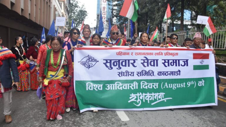 राष्ट्रसङ्घले सन् २०२४ मा मनाइने ३०औं विश्व आदिवासी दिवसका निम्ति ‘स्वेच्छिक रूपमा अलग बसिरहेका र भर्खरै सम्पर्कमा आएका आदिवासीहरूको अधिकार संरक्षण’ नारा तय गरेको छ । फोटोः मुकुन्द कालिकोटे/रिपोर्टर्स नेपाल