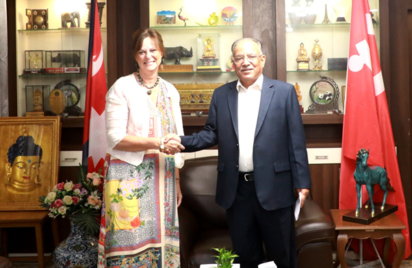 काठमाडौँ, ३० साउन । नेपालका लागि अष्ट्रेलियाका राजदूत फेलिसिटी भोल्कले नेपाल कम्युनिष्ट पार्टी (माओवादी केन्द्र)का अध्यक्ष एवं पूर्वप्रधानमन्त्री पुष्पकमल दाहाल ‘प्रचण्ड’सँग बिदाइ भेट गरेकी छिन्।