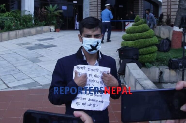 काठमाडौं, ३० साउन । संघीय संसद् भवनभित्र ‘नक्कली भुटानी शरनार्थीलाई कारबाही गर’ भन्दै विद्यार्थीहरुले प्रदर्शन गरेका छन् । प्रदर्शनकारीहरुले ‘नक्कली भुटानी शरणार्थी, सहकारी ठगी र गिरीबन्धुका नाइकेहरुलाई कारबाही गर’ लेखिएको प्लेकार्ड प्रदर्शन गरेका थिए ।