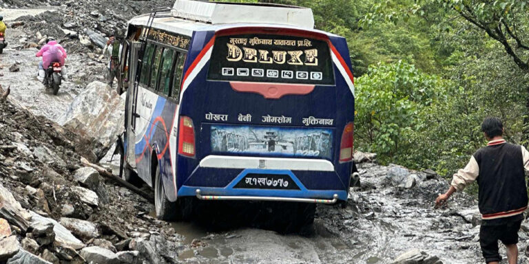 म्याग्दी, १२ भदौ । चीन र भारत जोड्ने राष्ट्रिय गौरवको बेनी–जोमसोम–कोरला सडकअन्तर्गत म्याग्दीको रघुगङ्गा गाउँपालिका–२ सिरुबारी क्षेत्रको पहिरोले दुर्घटनाको जोखिम बढेको छ । कालीगण्डकी किनारको पाखोमा निर्माण भएको सडकमा खस्ने पहिरोका कारण बेनी–जोमसोम सडकमा नियमित यातायात सञ्चालन प्रभावित हुनुका साथै दुर्घटनाको जोखिम बढेको हो ।