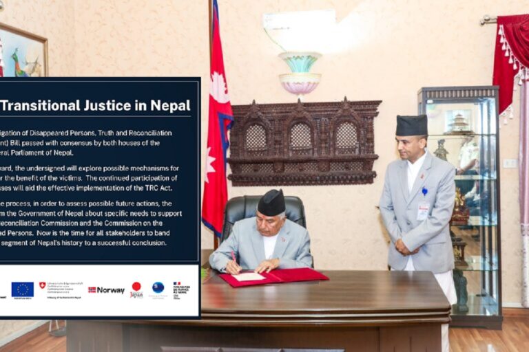 ती देशहरुले ऐन कार्यान्वयनमा आवश्यक सहयोग गर्ने पनि प्रतिवद्धता जनाएका छन् । ‘नेपाल सरकारले अगाडीको मार्ग पहिल्याउँदै गर्दा, हामी निम्नानुसारका हस्ताक्षरकर्ता पीडितको हितका लागि नेपाल सरकारलाई मद्दत पुर्‍याउने सम्भावित संयन्त्रहरूको खोजी गर्ने छौँ। निर्णय प्रक्रियाहरूमा पीडितको निरन्तर सहभागिताले सत्य निरूपण तथा मेलमिलाप ऐनको प्रभावकारी कार्यान्वयनमा सहयोग पुर्‍याउनेछ,’– विज्ञप्तिमा भनिएको छ ।