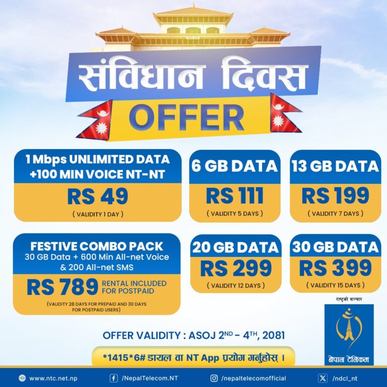 काठमाडौं, असोज २ । नेपाल टेलिकमले संविधान दिवसको अवसर पारी अफर ल्याएको छ । अफरअन्तर्गत ग्राहकले रु. ४९ मा १ दिन चलाउन सकिने १ एमबीपीएस अनलिमिटेड डाटा र नेपाल टेलिकमकै नेटवर्कभित्र कल गर्न सकिने १०० मिनेट अन नेट भ्वाइस सेवा ल्याएको छ ।