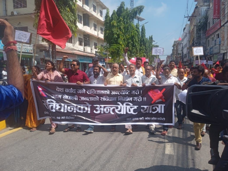 काठमाडौँ, ३ असोज । आम जनता पार्टी (आजपा) ले बर्तमान संविधानको खारेजीको माग गर्दै आज बिरगंजमा अन्त्येष्टि यात्रा निकालेको छ ।