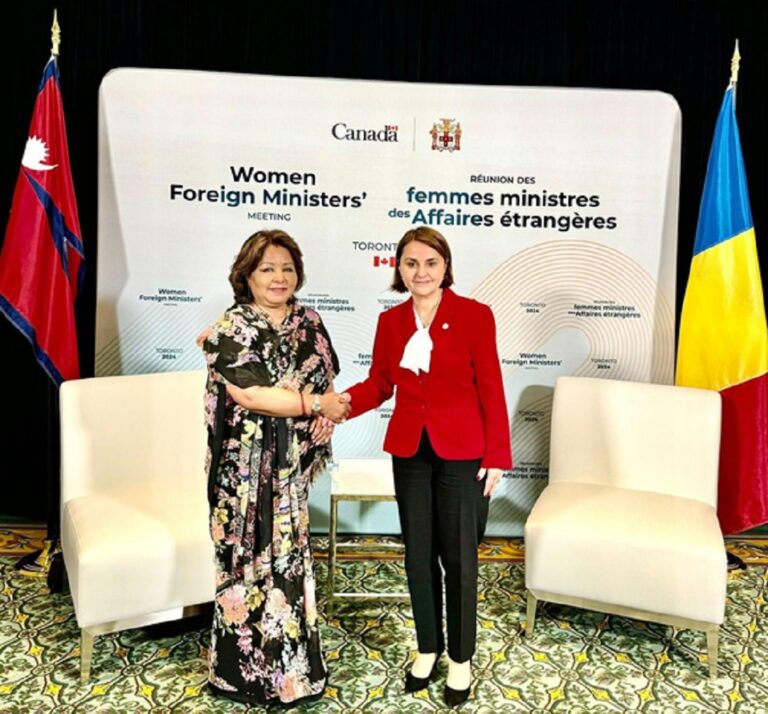 काठमाडौँ, ५ असोज । परराष्ट्रमन्त्री डा.आरजु राणा देउवा र रोमानियाका विदेशमन्त्री लुमिनिता ओडोबेस्कुबीच क्यानाडाको टोरन्टोमा शुक्रबार द्विपक्षीय भेटवार्ता भएको छ । सो भेटवार्ताका क्रममा नेपाल रोमानिया सम्बन्ध तथा दुई देशबीचको आपसी हितका विविध विषयमा कुराकानी भएको थियो ।