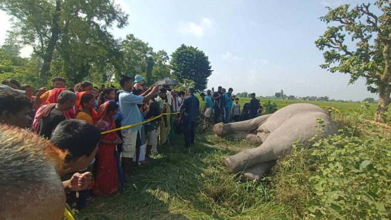 हात्तीको घाटीमा करेन्टको तार बेरिएको अवस्थामा छ । स्थानीय रमेश जिसीको धान खेतमा हात्ती मरेको अवस्थामा फेला परेको हो । २०८० फागुनमा सोही स्थानमा करिब तीन बर्षको पोथी बाघ समेत मृत अवस्थामा फेला परेको थियो ।