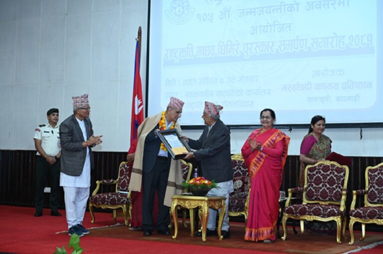 काठमाडौँ, ७ असोज । राष्ट्रपति रामचन्द्र पौडेलले नेपाली भाषा, साहित्यको विकासमा राष्ट्रकवि माधवप्रसाद घिमिरेको योगदान अतुलनीय रहेको बताएका छन् । राष्ट्रकवि माधवप्रसाद घिमिरेको एक सय ५औँ जन्मजयन्तीमा मर्स्याङ्दी वाङ्मय प्रतिष्ठानद्वारा आज राष्ट्रपति भवन शीतल निवासमा आयोजित पुरस्कार वितरण समारोहलाई सम्बोधन गर्दै राष्ट्रपति पौडेलले राष्ट्रकवि घिमिरेको योगदानको चर्चा गरेका हुन् ।