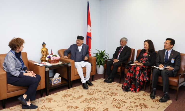 न्युयोर्क, असोज १० । प्रधानमन्त्री केपी शर्मा ओलीसँग मिलेनियम च्यालेञ्ज कर्पोरेशन (एमसिसी) का कार्यकारी प्रमुख एलिस अल्ब्राइटले शिष्टाचार भेट गरेकी छन् । संयुक्त राष्ट्रसङ्घको ७९औँ महासभामा भाग लिने क्रममा अमेरिकाको न्युयोर्कमा रहेका प्रधानमन्त्री ओलीसँगको भेटका अवसरमा प्रधानमन्त्रीका मुख्य सल्लाहकार विष्णुप्रसाद रिमाल, परराष्ट्र सचिव सेवा लम्साललगायत सहभागी रहेका थिए ।