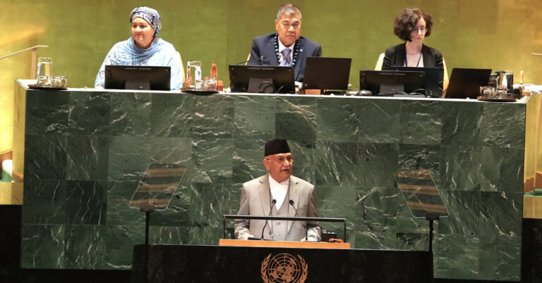 प्रधानमन्त्री ओलीले भने, “सामूहिक इच्छाशक्ति र एकीकृत कार्यद्वारा मात्र हामी यो प्रवृत्तिलाई उल्टाउन सक्छौँ र सबैका लागि दिगो शान्ति र साझा समृद्धिको युग प्रारम्भ गर्न सक्छौँ ।” यस सन्दर्भमा महासभाको उक्त सत्रको विषयवस्तु ‘कसैलाई पछाडि नछाडिनेः वर्तमान र भावी पुस्तालाई शान्ति, दिगो विकास र मानवीय प्रतिष्ठाको उन्नतिका लागि एकजुट भएर काम गरौँ’ भन्ने आदर्श वाक्य समयोचित भएको बताए ।