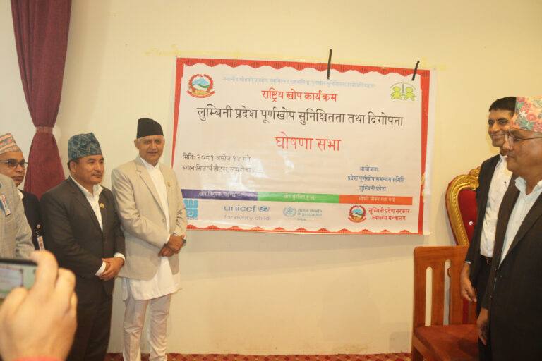 लुम्बिनी, १४ असोज । लुम्बिनी प्रदेश पूर्ण खोप सुनिश्चित तथा दिगोपना घोषणा गरिएको छ । १५ महिनाभन्दा कम उमेरका बालबालिकालाई राष्ट्रिय खोप तालिका बमोजिम पाउनुपर्ने सबै मात्रा खोप लिएको अवस्थालाई सुनिश्चित गरिएपछि प्रदेशका मुख्यमन्त्री चेतनारायण आचार्यले आज एक कार्यक्रमकाबीच प्रदेशलाई पूर्णखोप सुनिश्चित भएको घोषणा गरेको हो ।