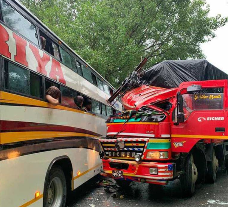 आज बिहान चितवनको मुग्लिन–नारायणगढ सडकखण्डको सिमलतालमा आर ०१ आई ६३७२ नम्बरको भारतीय बस र ग २ ख ११०८ नम्बरको नेपाली ट्रक एकआपसमा ठोक्किएका थिए।