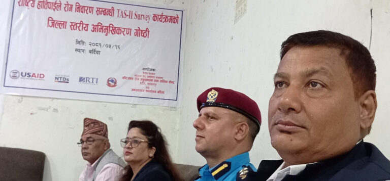 विश्व स्वास्थ्य सङ्गठन (डब्लुएचओ) ले तोकेका विद्यालयमा हात्तीपाइले रोगको दोस्रो चरणको ट्रान्समिशन सर्भे सुरु गरिएको हो । कक्षा १ र २ मा अध्ययनरत ६ देखि ७ वर्षका बालबालिकामा हात्तीपाइले रोगको ट्रान्समिशन परीक्षण सुरु गरिएको स्वास्थ्य तथा जनसङ्ख्या मन्त्रालय कीटजन्य रोग अनुसन्धान तथा तालिम केन्द्र मकवानपुरका ल्याब निरीक्षक राजकुमार इटनीले बताए । नयाँ सङ्क्रमण जाच्न बालबालिकाको सो उमेर समूह उपयुक्त मानिएको छ । बर्दियामा तीन सय ७३ विद्यालयका १८ हजार नौ सय ५० विद्यार्थीमध्ये ३७ विद्यालयका एक हजार पाँच सय ५२ विद्यार्थीहरुको नमूना परीक्षण गरिनेछ ।