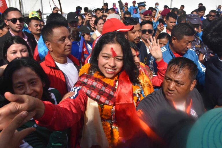 नेपाली खेलकुदमा इतिहास रचेकी पलेशालाई विमानस्थलमा भव्य स्वागत