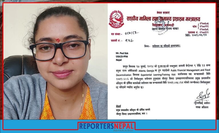काठमाडौं, २० भदौ । संघीय मामिला तथा सामान्य प्रशासन मन्त्रालयले बाराको जितपुरसिमरा उपमहानगरपालिकाकी प्रमुख प्रशासकीय अधिकृत उर्मिला काफ्लेको अमेरिका भ्रमण रद्द गरेको छ । काफ्ले आगमी सेप्टेम्बर ९ देखि १३ सम्म संयु्क्त राज्य अमेरिकामा हुनगइरहेको ‘पब्लिक फानान्सिएल म्यानेजमेन्ट एण्ड फिस्कल डिसेन्ट्रालाइजेसन’ प्रोगाममा सहभागी हुन जान काठमाडौं आइसकेकी थिईन् । सो प्रोगाममा सहभागी हुनका लागि उनले अन्तरवार्ता दिएर भिसा जारी भइसकेको थियो । अन्ततः भदौ २१ गते उड्ने तयारीमा रहेकी काफ्लेको भ्रमण रद्द गरेको हो ।