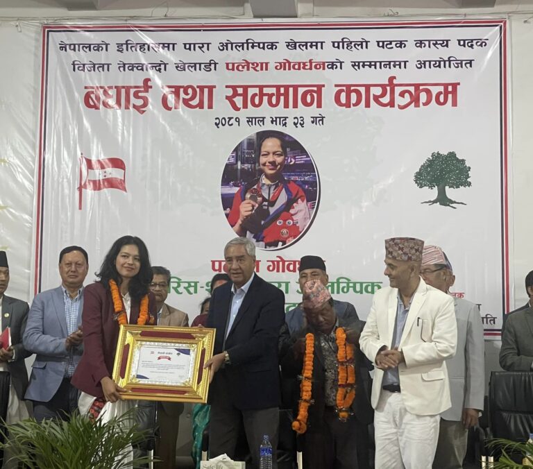 काठमाडौं, २३ भदौ । नेपाली कांग्रेसले पारा ओलम्पिक खेलमा कांस्य पदक विजेता खेलाडी पलेशा गोवर्धनलाई नगद पुरस्कारसहित सम्मान गरेको छ । आज (आइतबार) पार्टी सभापति शेरबहादुर देउवाले पलेशालाई नगद ५ लाख पुरस्कारसहित सम्मान गरेका हुन् ।