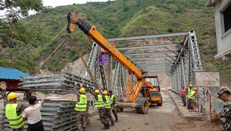 निर्माणको काम सुरु गरेको छ ।उक्त पुल मर्मत गरी आवागमन सुचारु गर्न शनिबारदृखि खटिएको प्राविधिक सहितको नेपाली सेनाको टोलीले उक्त स्थानमा आइतबारबाट बेलिब्रीज जडान कार्य सुरु गरेको हो ।