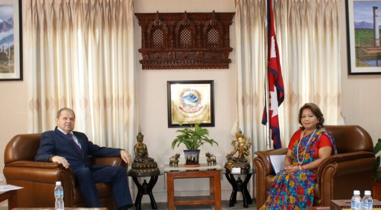काठमाडौं, २१ असोज । नेपालका लागि रसियाका राजदूत एलेक्सी नोभिकले परराष्ट्रमन्त्री डा. आरजु राणासँग भेटवार्ता गरेका छन् । आज (सोमबार) अपरान्ह सिंहदरबारस्थित् मन्त्रालयमा पुगेर राजदूत नोभिकले शिष्टाचार भेटवार्ता गरेका हुन् ।