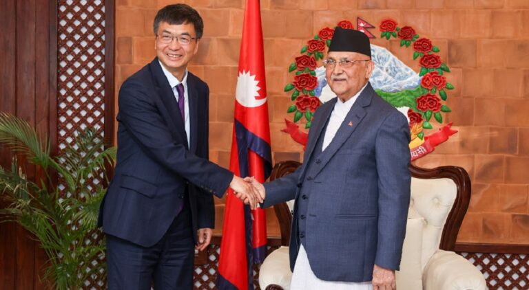 काठमाडौँ । प्रधानमन्त्री एवं नेकपा (एमाले) का अध्यक्ष केपी शर्मा ओलीसँग नेपाल भ्रमणमा रहेको चिनियाँ कम्युनिस्ट पार्टीका केन्द्रीय कमिटीका सदस्य एवं सिङहाइ प्रान्तका सेक्रेटरी छेन् गाङ्ग नेतृत्वको प्रतिनिधिमण्डलले आज शिष्टाचार भेट गरेको छ ।